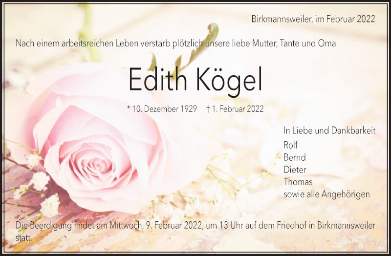 Hier finden Sie alle Traueranzeigen aus der Zeitung, die bisher für Edith Kögel erschienen sind. Weitere Traueranzeigen, die in der Zeitung erscheinen, werden hier ebenfalls aufgelistet