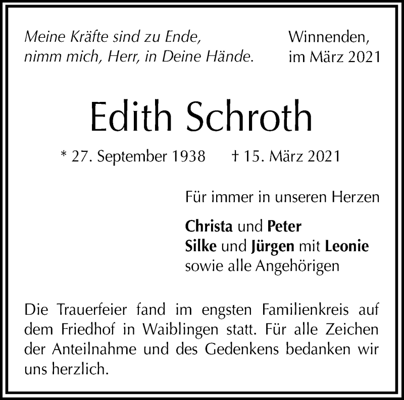Hier finden Sie alle Traueranzeigen aus der Zeitung, die bisher für Edith Schroth erschienen sind. Weitere Traueranzeigen, die in der Zeitung erscheinen, werden hier ebenfalls aufgelistet