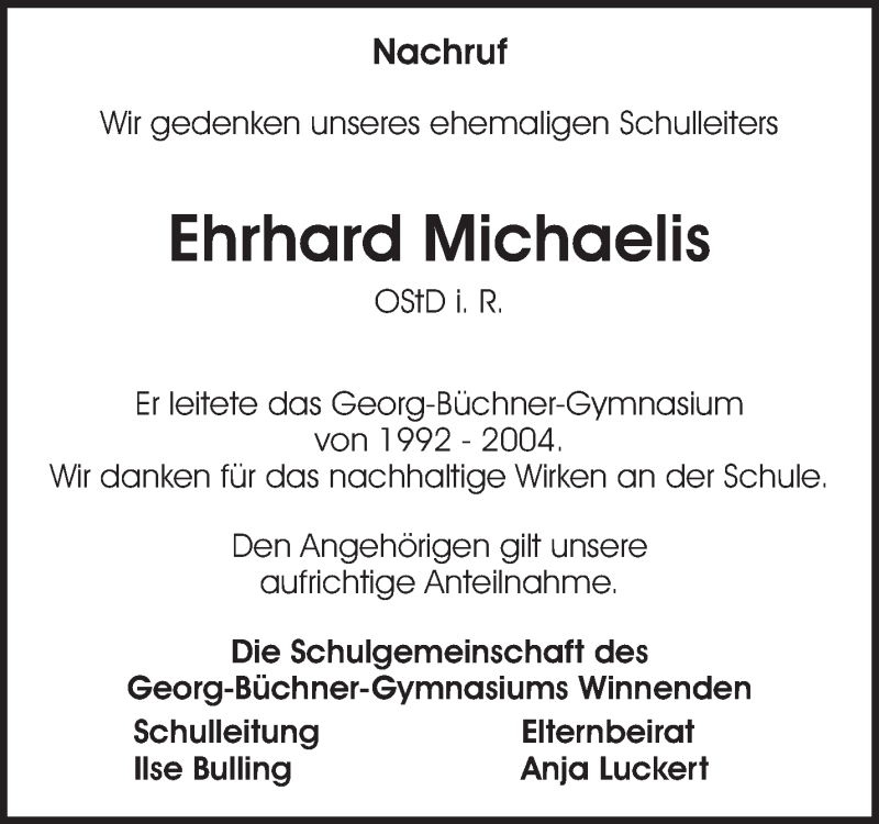Hier finden Sie alle Traueranzeigen aus der Zeitung, die bisher für Ehrhard Michaelis erschienen sind. Weitere Traueranzeigen, die in der Zeitung erscheinen, werden hier ebenfalls aufgelistet