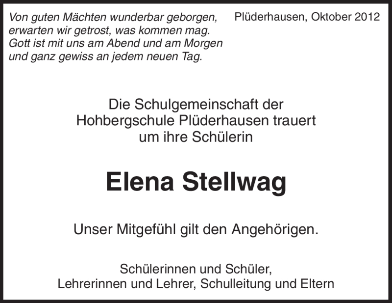 Hier finden Sie alle Traueranzeigen aus der Zeitung, die bisher für Elena Stellwag erschienen sind. Weitere Traueranzeigen, die in der Zeitung erscheinen, werden hier ebenfalls aufgelistet