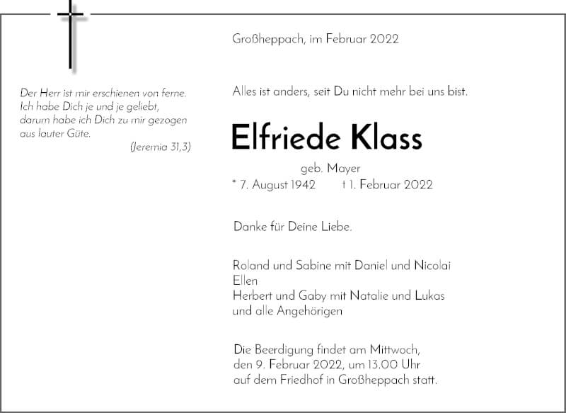 Hier finden Sie alle Traueranzeigen aus der Zeitung, die bisher für Elfriede Klass erschienen sind. Weitere Traueranzeigen, die in der Zeitung erscheinen, werden hier ebenfalls aufgelistet