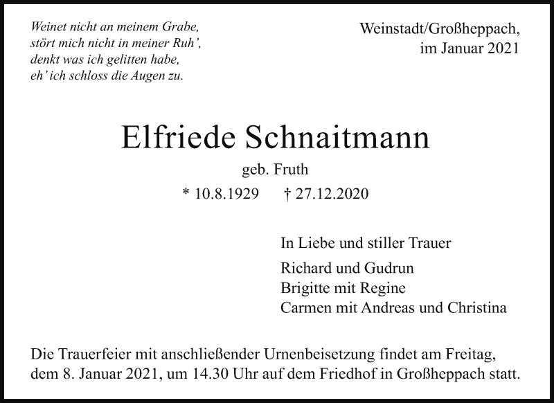 Hier finden Sie alle Traueranzeigen aus der Zeitung, die bisher für Elfriede Schnaitmann erschienen sind. Weitere Traueranzeigen, die in der Zeitung erscheinen, werden hier ebenfalls aufgelistet