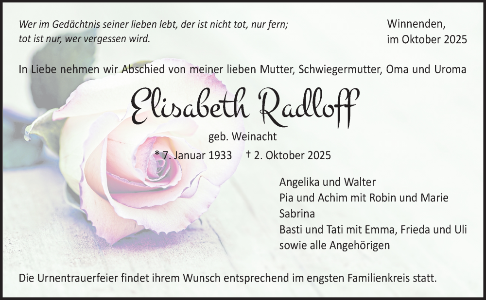 Hier finden Sie alle Traueranzeigen aus der Zeitung, die bisher für Elisabeth Radloff erschienen sind. Weitere Traueranzeigen, die in der Zeitung erscheinen, werden hier ebenfalls aufgelistet