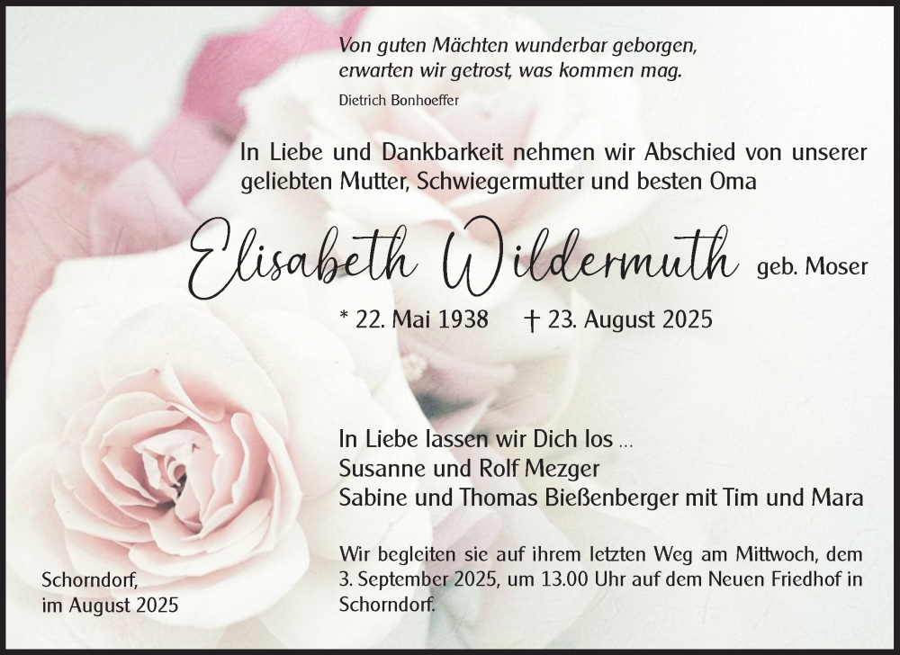 Hier finden Sie alle Traueranzeigen aus der Zeitung, die bisher für Elisabeth Wildermuth erschienen sind. Weitere Traueranzeigen, die in der Zeitung erscheinen, werden hier ebenfalls aufgelistet