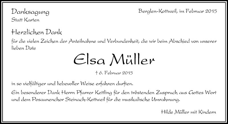 Hier finden Sie alle Traueranzeigen aus der Zeitung, die bisher für Elsa Müller erschienen sind. Weitere Traueranzeigen, die in der Zeitung erscheinen, werden hier ebenfalls aufgelistet
