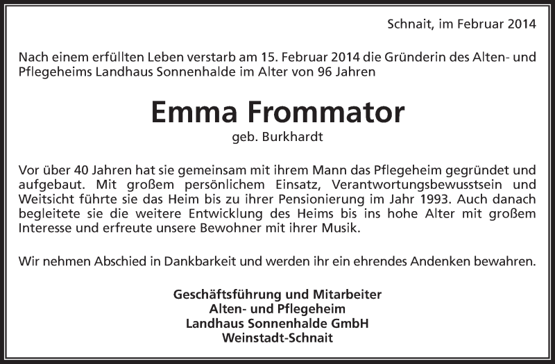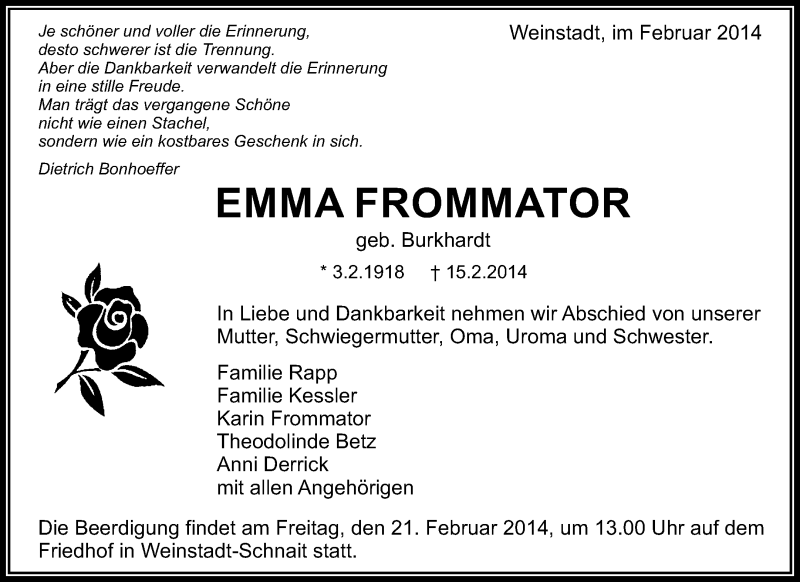 Hier finden Sie alle Traueranzeigen aus der Zeitung, die bisher für Emma Frommator erschienen sind. Weitere Traueranzeigen, die in der Zeitung erscheinen, werden hier ebenfalls aufgelistet