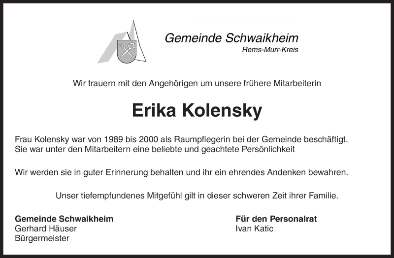 Hier finden Sie alle Traueranzeigen aus der Zeitung, die bisher für Erika Kolensky erschienen sind. Weitere Traueranzeigen, die in der Zeitung erscheinen, werden hier ebenfalls aufgelistet
