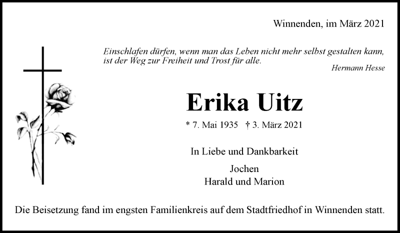 Hier finden Sie alle Traueranzeigen aus der Zeitung, die bisher für Erika Uitz erschienen sind. Weitere Traueranzeigen, die in der Zeitung erscheinen, werden hier ebenfalls aufgelistet