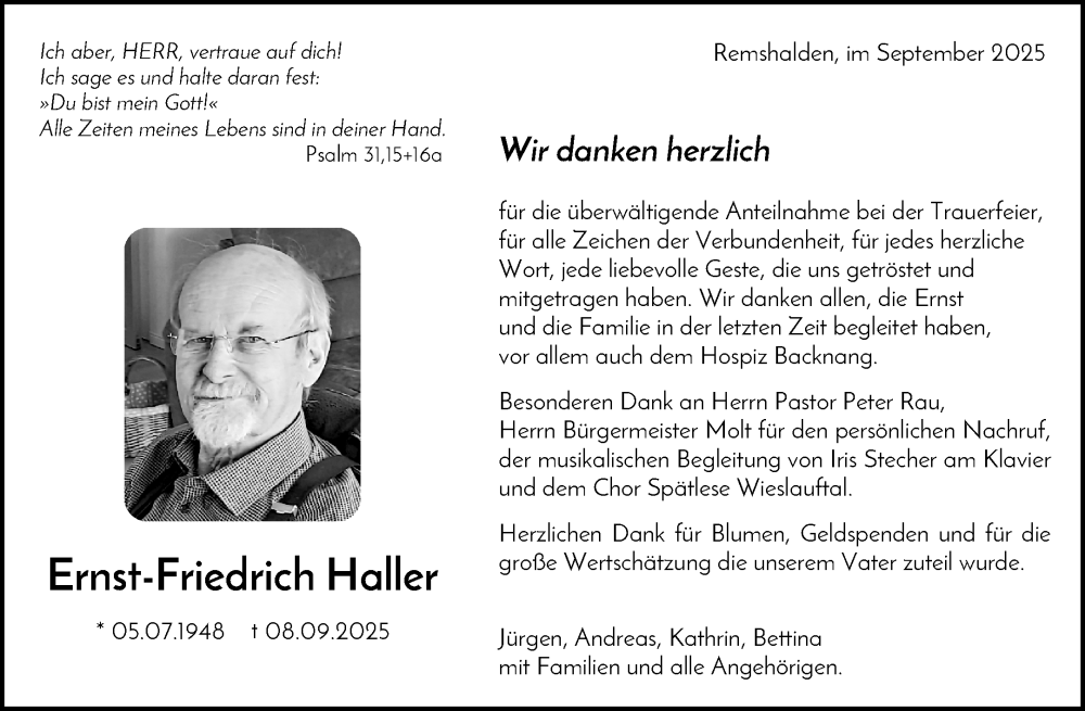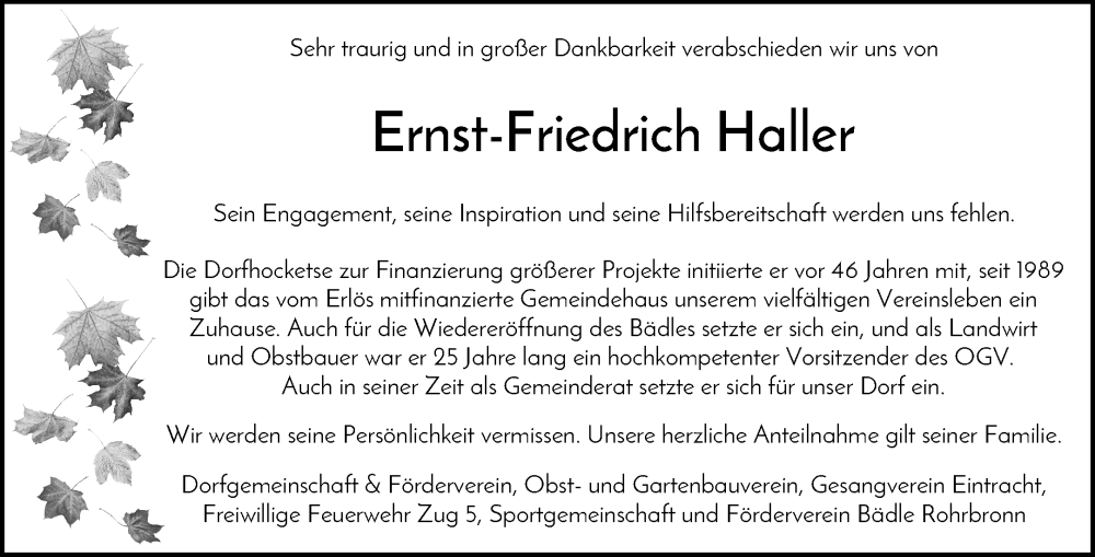 Hier finden Sie alle Traueranzeigen aus der Zeitung, die bisher für Ernst-Friedrich Haller erschienen sind. Weitere Traueranzeigen, die in der Zeitung erscheinen, werden hier ebenfalls aufgelistet
