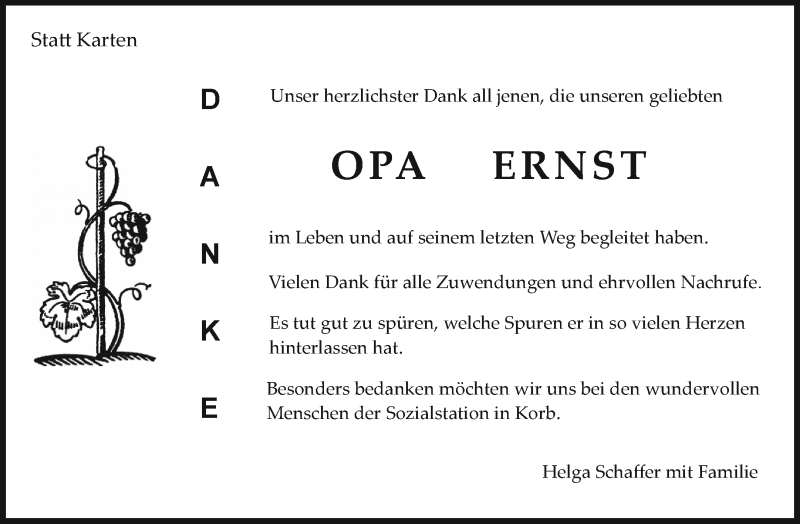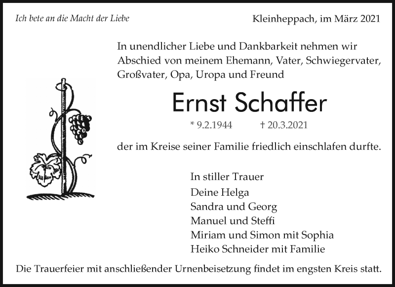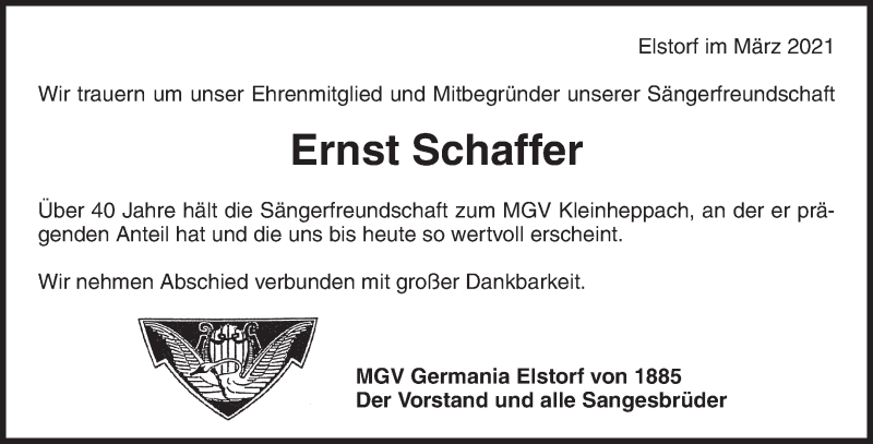 Hier finden Sie alle Traueranzeigen aus der Zeitung, die bisher für Ernst Schaffer erschienen sind. Weitere Traueranzeigen, die in der Zeitung erscheinen, werden hier ebenfalls aufgelistet