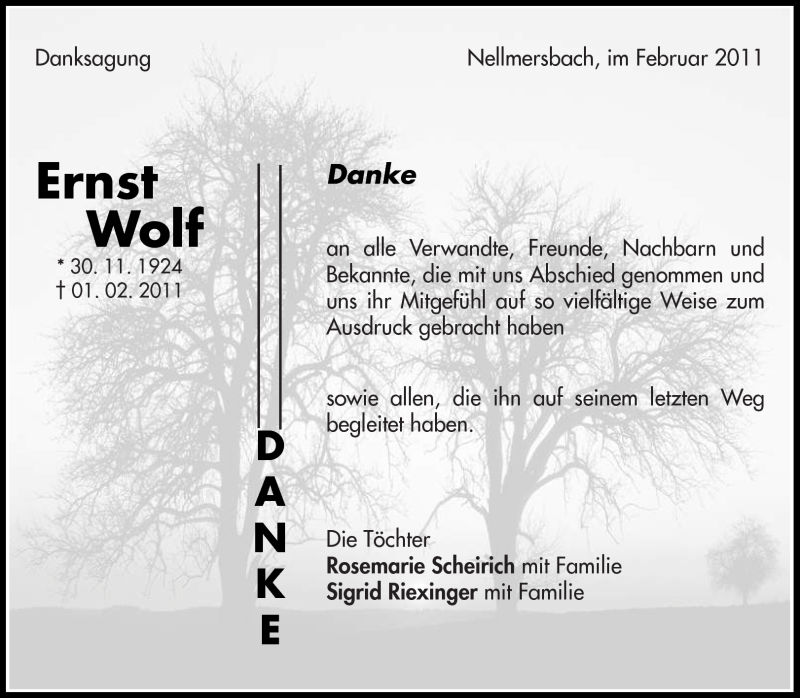 Hier finden Sie alle Traueranzeigen aus der Zeitung, die bisher für Ernst Wolf erschienen sind. Weitere Traueranzeigen, die in der Zeitung erscheinen, werden hier ebenfalls aufgelistet