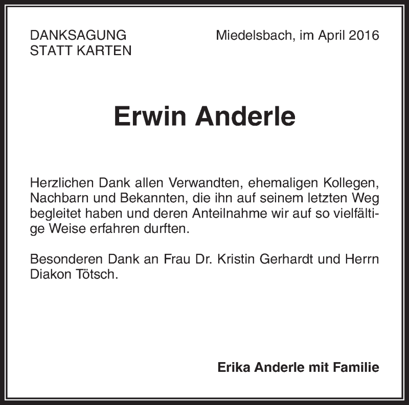Hier finden Sie alle Traueranzeigen aus der Zeitung, die bisher für Erwin Anderle erschienen sind. Weitere Traueranzeigen, die in der Zeitung erscheinen, werden hier ebenfalls aufgelistet