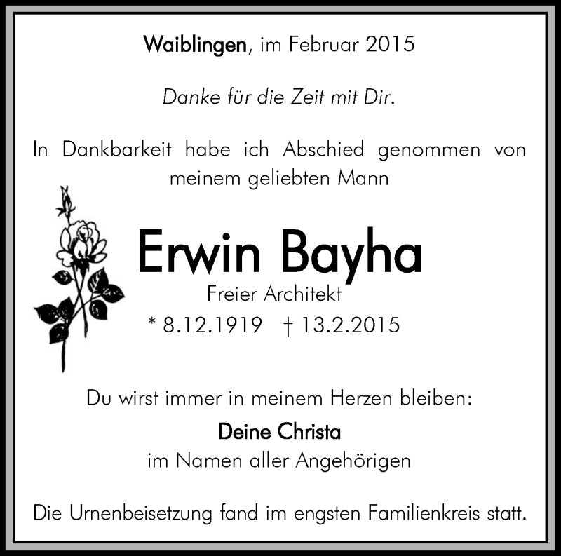 Hier finden Sie alle Traueranzeigen aus der Zeitung, die bisher für Erwin Bayha erschienen sind. Weitere Traueranzeigen, die in der Zeitung erscheinen, werden hier ebenfalls aufgelistet