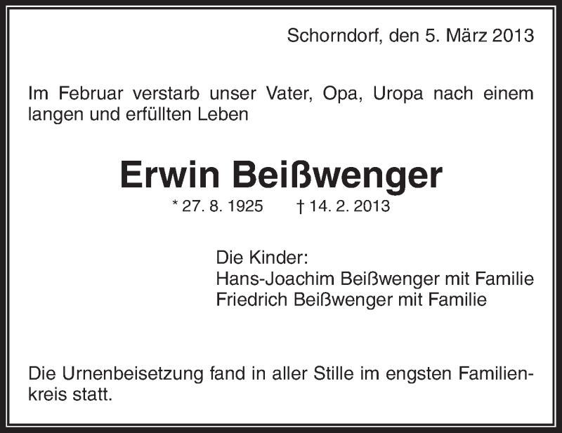 Hier finden Sie alle Traueranzeigen aus der Zeitung, die bisher für Erwin Beißwenger erschienen sind. Weitere Traueranzeigen, die in der Zeitung erscheinen, werden hier ebenfalls aufgelistet