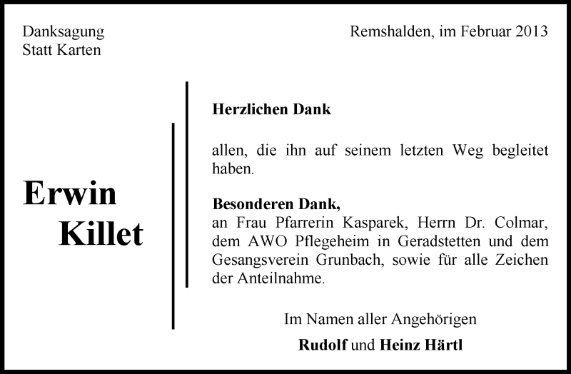 Hier finden Sie alle Traueranzeigen aus der Zeitung, die bisher für Erwin Killet erschienen sind. Weitere Traueranzeigen, die in der Zeitung erscheinen, werden hier ebenfalls aufgelistet