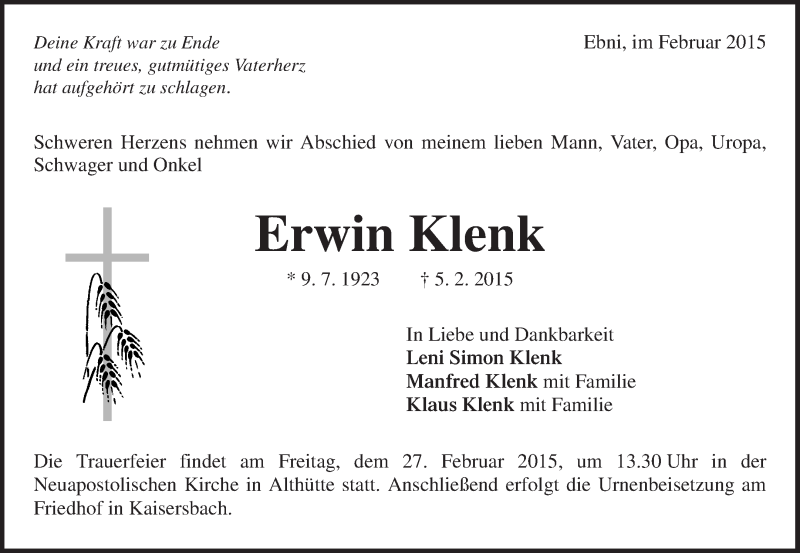 Hier finden Sie alle Traueranzeigen aus der Zeitung, die bisher für Erwin Klenk erschienen sind. Weitere Traueranzeigen, die in der Zeitung erscheinen, werden hier ebenfalls aufgelistet