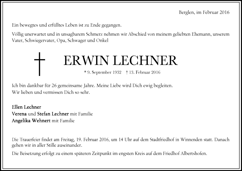 Hier finden Sie alle Traueranzeigen aus der Zeitung, die bisher für Erwin Lechner erschienen sind. Weitere Traueranzeigen, die in der Zeitung erscheinen, werden hier ebenfalls aufgelistet