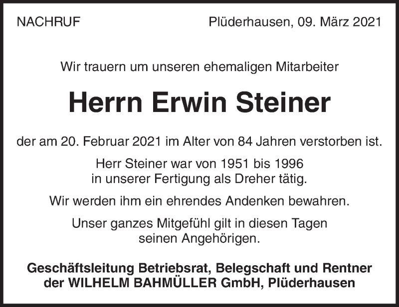 Hier finden Sie alle Traueranzeigen aus der Zeitung, die bisher für Erwin Steiner erschienen sind. Weitere Traueranzeigen, die in der Zeitung erscheinen, werden hier ebenfalls aufgelistet