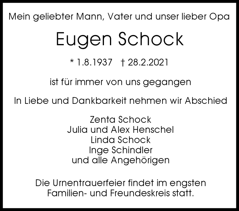 Hier finden Sie alle Traueranzeigen aus der Zeitung, die bisher für Eugen Schock erschienen sind. Weitere Traueranzeigen, die in der Zeitung erscheinen, werden hier ebenfalls aufgelistet