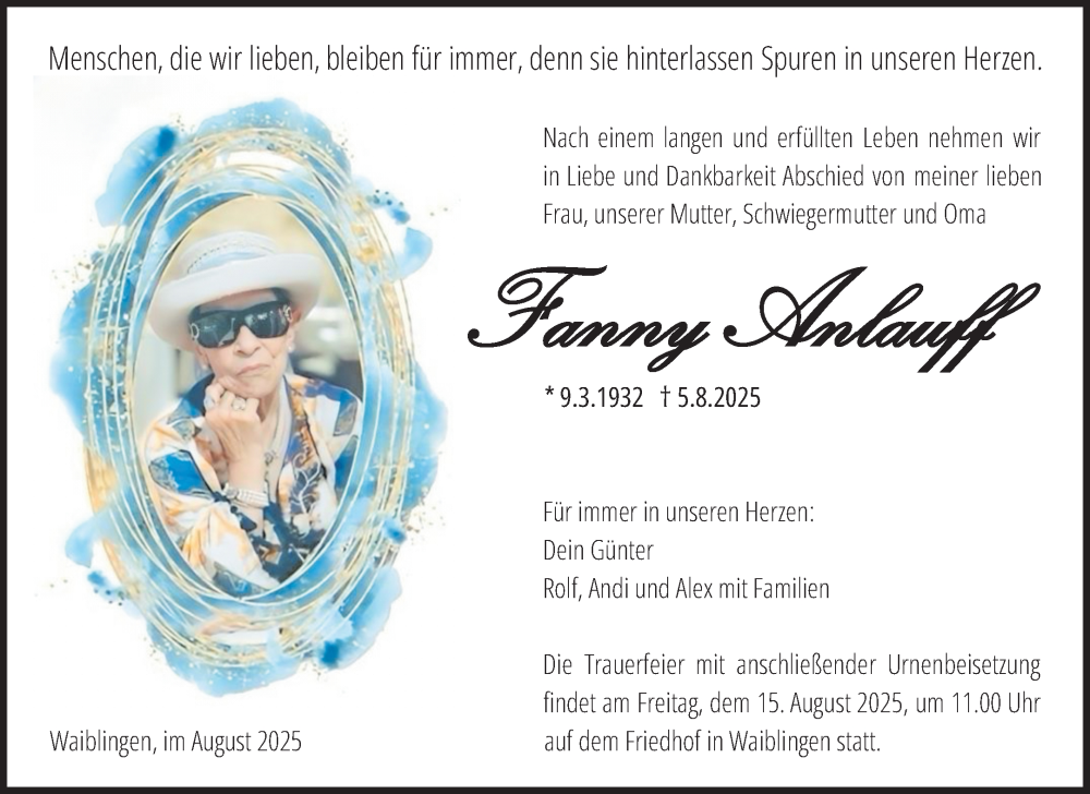 Hier finden Sie alle Traueranzeigen aus der Zeitung, die bisher für Fanny Anlauf erschienen sind. Weitere Traueranzeigen, die in der Zeitung erscheinen, werden hier ebenfalls aufgelistet