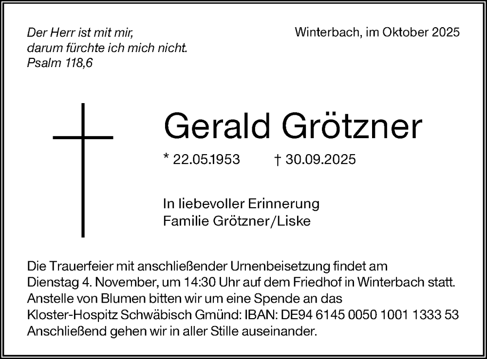 Hier finden Sie alle Traueranzeigen aus der Zeitung, die bisher für Gerald Grötzner erschienen sind. Weitere Traueranzeigen, die in der Zeitung erscheinen, werden hier ebenfalls aufgelistet