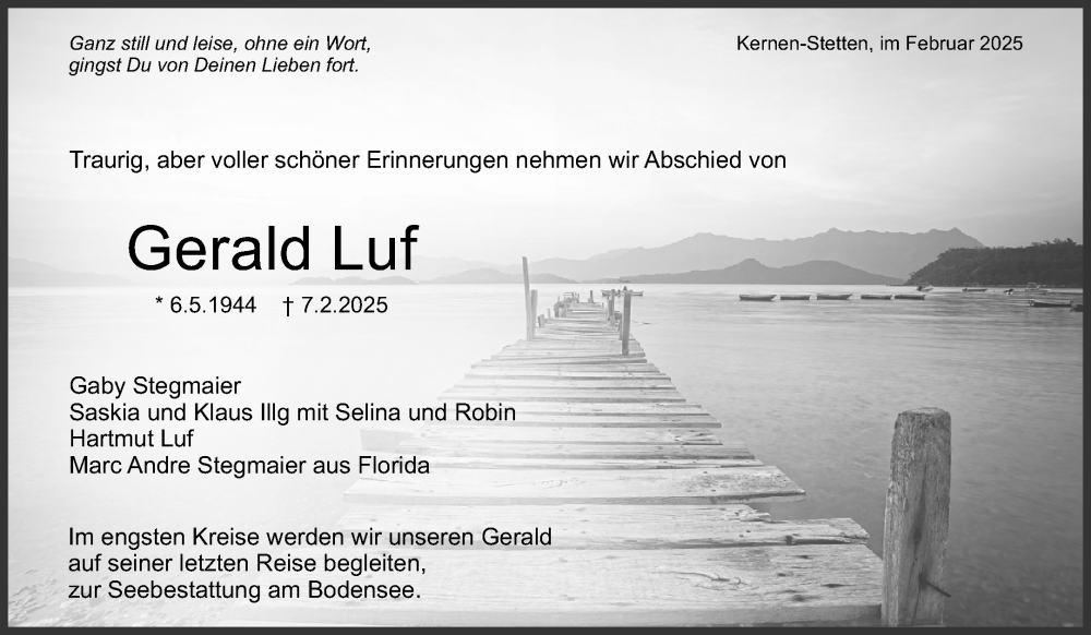 Hier finden Sie alle Traueranzeigen aus der Zeitung, die bisher für Gerald Luf erschienen sind. Weitere Traueranzeigen, die in der Zeitung erscheinen, werden hier ebenfalls aufgelistet