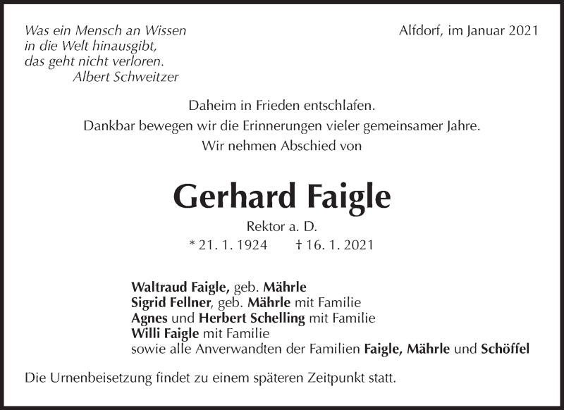 Hier finden Sie alle Traueranzeigen aus der Zeitung, die bisher für Gerhard Faigle erschienen sind. Weitere Traueranzeigen, die in der Zeitung erscheinen, werden hier ebenfalls aufgelistet