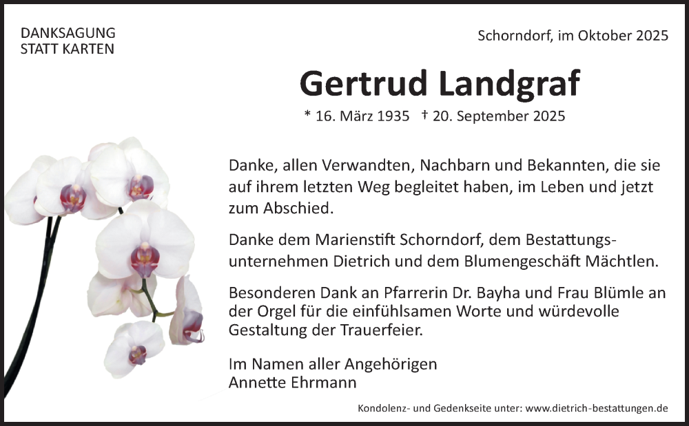 Hier finden Sie alle Traueranzeigen aus der Zeitung, die bisher für Gertrud Landgraf erschienen sind. Weitere Traueranzeigen, die in der Zeitung erscheinen, werden hier ebenfalls aufgelistet