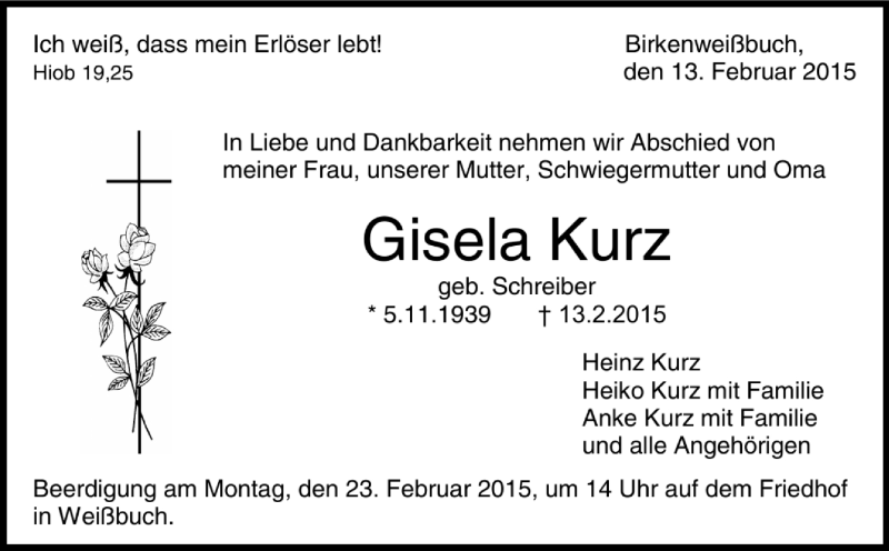 Hier finden Sie alle Traueranzeigen aus der Zeitung, die bisher für Gisela Kurz erschienen sind. Weitere Traueranzeigen, die in der Zeitung erscheinen, werden hier ebenfalls aufgelistet