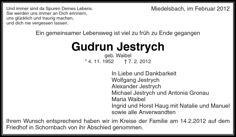 Hier finden Sie alle Traueranzeigen aus der Zeitung, die bisher für Gudrun Jestrych erschienen sind. Weitere Traueranzeigen, die in der Zeitung erscheinen, werden hier ebenfalls aufgelistet