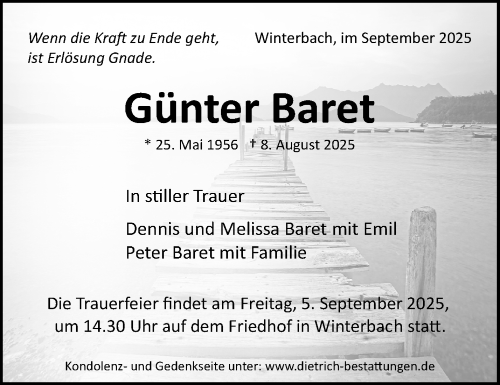 Hier finden Sie alle Traueranzeigen aus der Zeitung, die bisher für Günter Baret erschienen sind. Weitere Traueranzeigen, die in der Zeitung erscheinen, werden hier ebenfalls aufgelistet