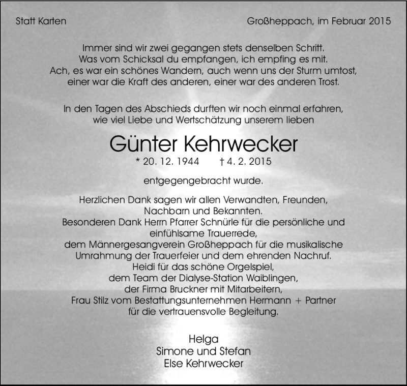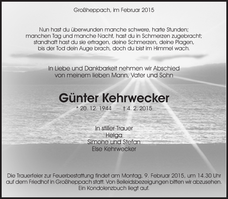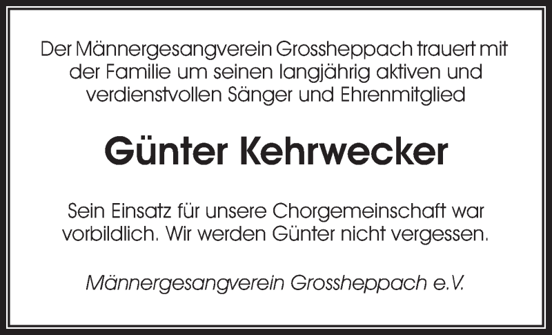 Hier finden Sie alle Traueranzeigen aus der Zeitung, die bisher für Günter Kehrwecker erschienen sind. Weitere Traueranzeigen, die in der Zeitung erscheinen, werden hier ebenfalls aufgelistet