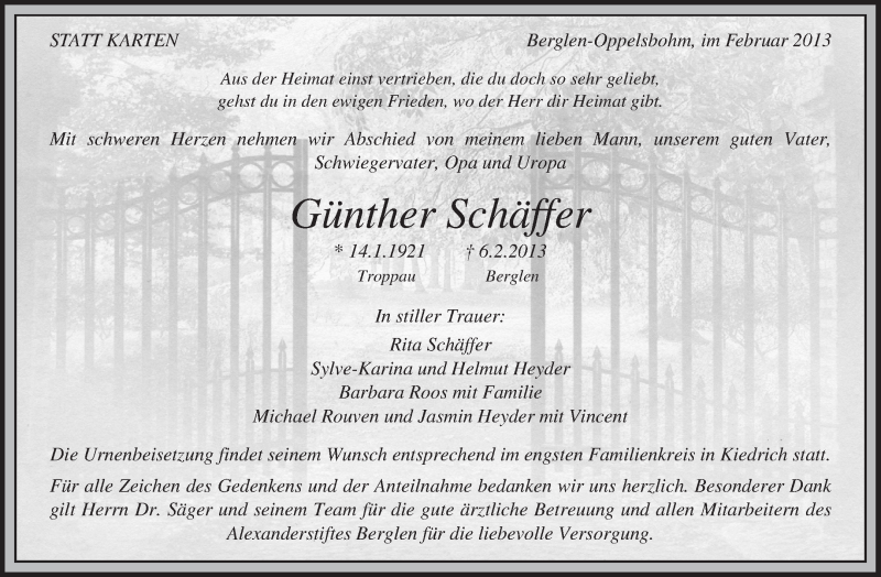 Hier finden Sie alle Traueranzeigen aus der Zeitung, die bisher für Günther Schäffer erschienen sind. Weitere Traueranzeigen, die in der Zeitung erscheinen, werden hier ebenfalls aufgelistet