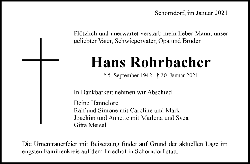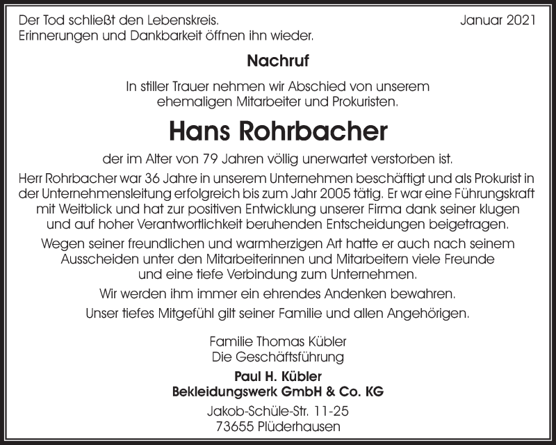 Hier finden Sie alle Traueranzeigen aus der Zeitung, die bisher für Hans Rohrbacher erschienen sind. Weitere Traueranzeigen, die in der Zeitung erscheinen, werden hier ebenfalls aufgelistet