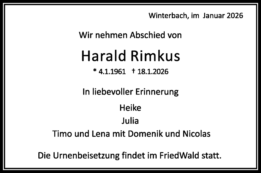 Hier finden Sie alle Traueranzeigen aus der Zeitung, die bisher für Harald Rimkus erschienen sind. Weitere Traueranzeigen, die in der Zeitung erscheinen, werden hier ebenfalls aufgelistet