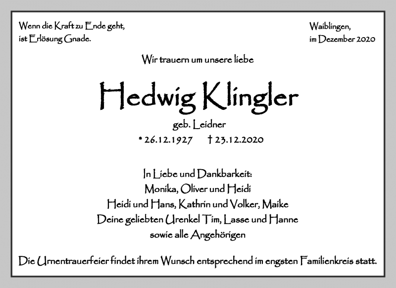 Hier finden Sie alle Traueranzeigen aus der Zeitung, die bisher für Hedwig Klingler erschienen sind. Weitere Traueranzeigen, die in der Zeitung erscheinen, werden hier ebenfalls aufgelistet
