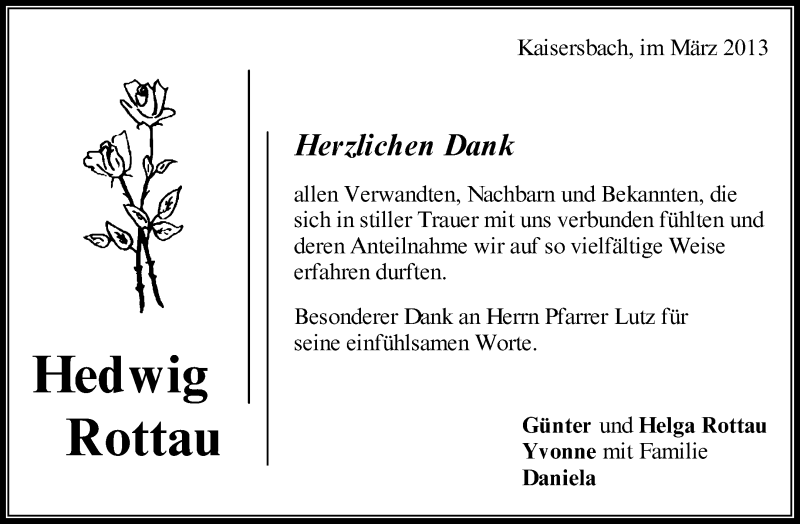 Hier finden Sie alle Traueranzeigen aus der Zeitung, die bisher für Hedwig Rottau erschienen sind. Weitere Traueranzeigen, die in der Zeitung erscheinen, werden hier ebenfalls aufgelistet