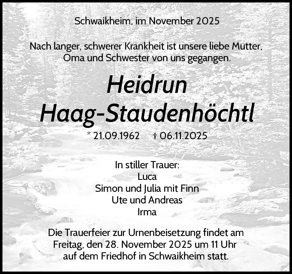 Hier finden Sie alle Traueranzeigen aus der Zeitung, die bisher für Heidrun Haag-Staudenhöchtl erschienen sind. Weitere Traueranzeigen, die in der Zeitung erscheinen, werden hier ebenfalls aufgelistet