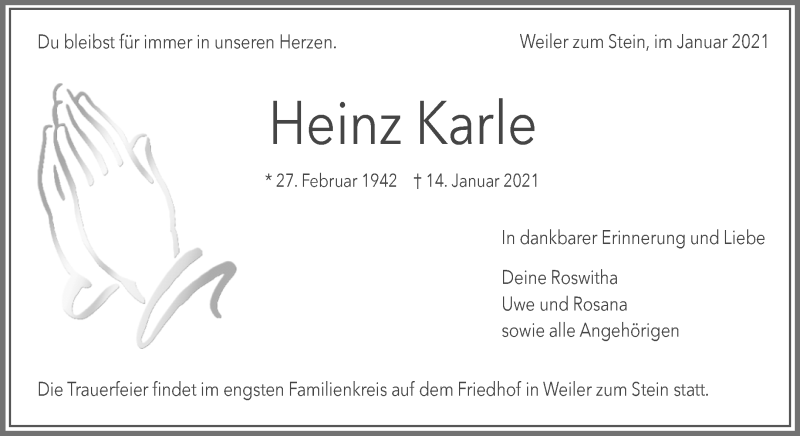Hier finden Sie alle Traueranzeigen aus der Zeitung, die bisher für Heinz Karle erschienen sind. Weitere Traueranzeigen, die in der Zeitung erscheinen, werden hier ebenfalls aufgelistet