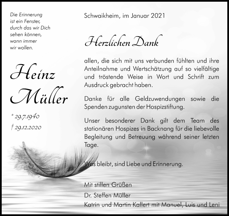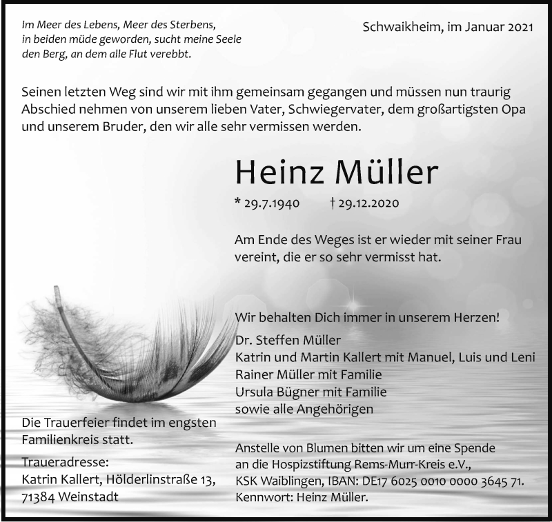 Hier finden Sie alle Traueranzeigen aus der Zeitung, die bisher für Heinz Müller erschienen sind. Weitere Traueranzeigen, die in der Zeitung erscheinen, werden hier ebenfalls aufgelistet