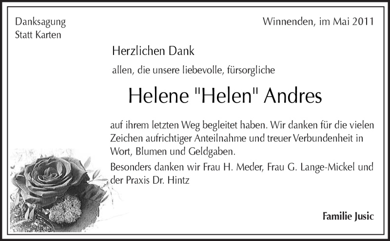 Hier finden Sie alle Traueranzeigen aus der Zeitung, die bisher für Helene Andres erschienen sind. Weitere Traueranzeigen, die in der Zeitung erscheinen, werden hier ebenfalls aufgelistet