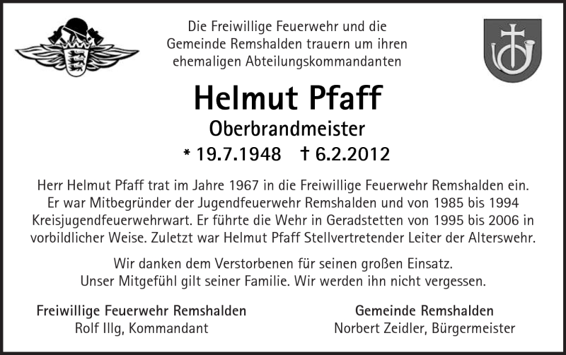 Hier finden Sie alle Traueranzeigen aus der Zeitung, die bisher für Helmut Pfaff erschienen sind. Weitere Traueranzeigen, die in der Zeitung erscheinen, werden hier ebenfalls aufgelistet
