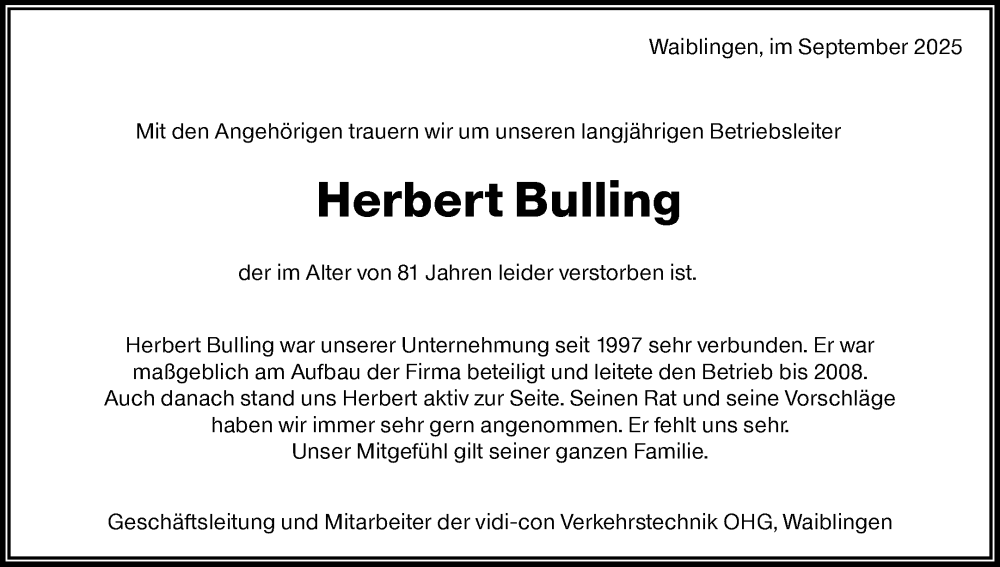 Hier finden Sie alle Traueranzeigen aus der Zeitung, die bisher für Herbert Bulling erschienen sind. Weitere Traueranzeigen, die in der Zeitung erscheinen, werden hier ebenfalls aufgelistet
