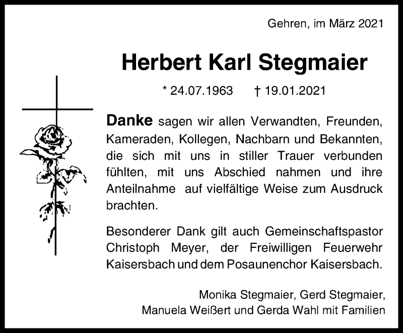Hier finden Sie alle Traueranzeigen aus der Zeitung, die bisher für Herbert Karl Stegmaier erschienen sind. Weitere Traueranzeigen, die in der Zeitung erscheinen, werden hier ebenfalls aufgelistet