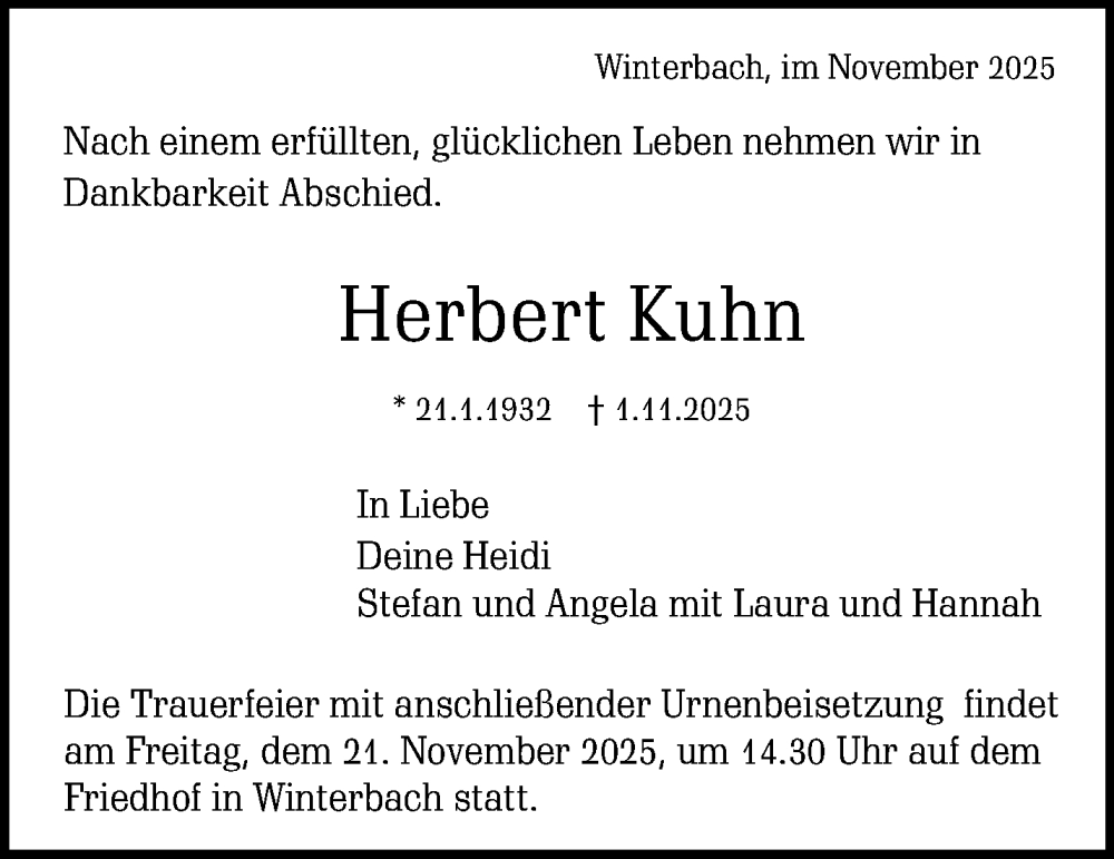 Hier finden Sie alle Traueranzeigen aus der Zeitung, die bisher für Herbert Kuhn erschienen sind. Weitere Traueranzeigen, die in der Zeitung erscheinen, werden hier ebenfalls aufgelistet