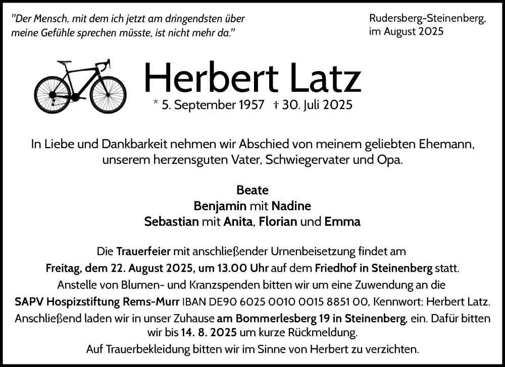 Hier finden Sie alle Traueranzeigen aus der Zeitung, die bisher für Herbert Latz erschienen sind. Weitere Traueranzeigen, die in der Zeitung erscheinen, werden hier ebenfalls aufgelistet
