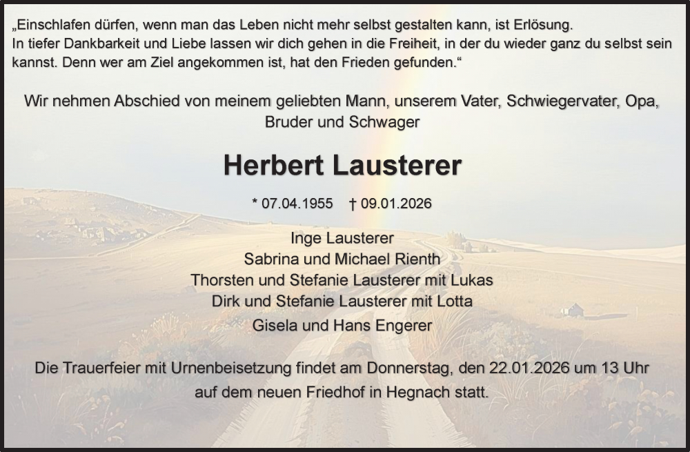 Hier finden Sie alle Traueranzeigen aus der Zeitung, die bisher für Herbert Lausterer erschienen sind. Weitere Traueranzeigen, die in der Zeitung erscheinen, werden hier ebenfalls aufgelistet