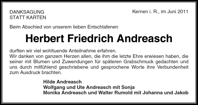 Hier finden Sie alle Traueranzeigen aus der Zeitung, die bisher für Herbert Friedrich Andreasch erschienen sind. Weitere Traueranzeigen, die in der Zeitung erscheinen, werden hier ebenfalls aufgelistet