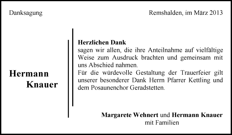 Hier finden Sie alle Traueranzeigen aus der Zeitung, die bisher für Hermann Knauer erschienen sind. Weitere Traueranzeigen, die in der Zeitung erscheinen, werden hier ebenfalls aufgelistet