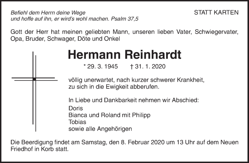 Hier finden Sie alle Traueranzeigen aus der Zeitung, die bisher für Hermann Reinhardt erschienen sind. Weitere Traueranzeigen, die in der Zeitung erscheinen, werden hier ebenfalls aufgelistet